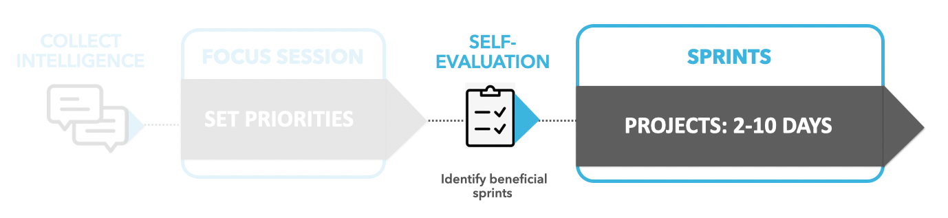 Sprints —Ongoing Skill Development & Execution: Close skill gaps, refine market strategy, optimize customer experience, continuously engage teams, and accelerate growth.