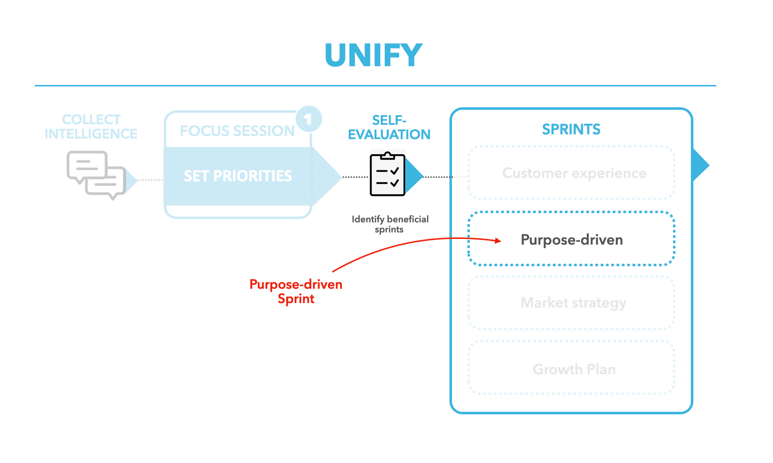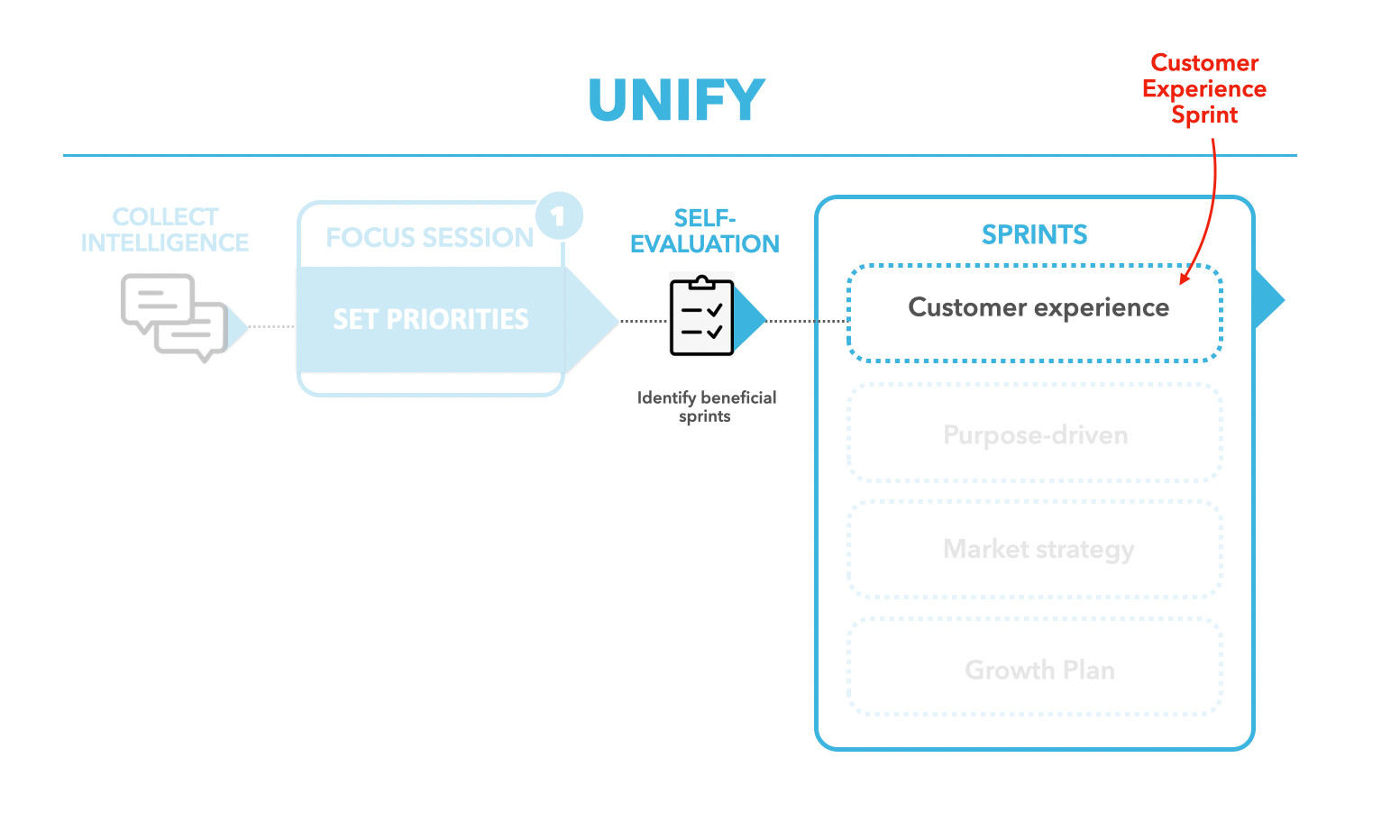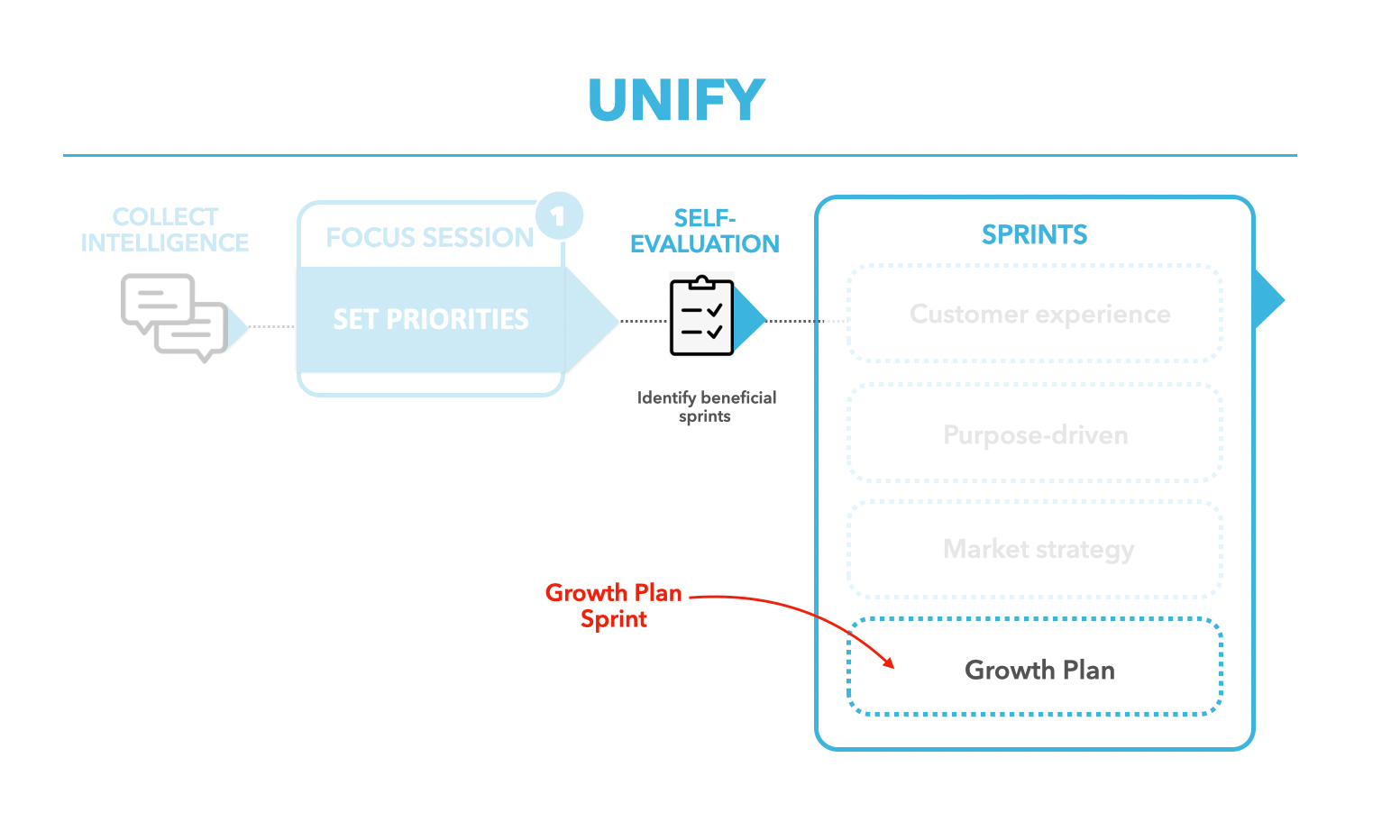 After your Unify Focus Day, you can utilize these fast, simple and out-come driven sprints. Your team will learn valuable skills while executing, ensuring a solid foundation for your core business plus continued dedication from your team. You can use the self-diagnostic assessment to make it easy to determine if your team has any capability gaps these sprints will address.